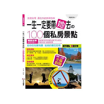 ![]() | 書名: 一生一定要帶她去的一百個私房景點 百萬人氣旅遊部落客肉魯,十多年來用雙腳與攝影機紀錄台灣的每一個角落。 透過本書精彩的攝影照片與作者親身體驗的文字推薦,讓男生女生們知道,不一定要出國旅遊,單單在台灣本島,還有許許多多你不知道,且一生必去的浪漫私房景點。 本書並由瘋台灣民宿網、日月行館、宜蘭傳統藝術中心提供多樣優惠與免費住宿體驗,豐富內容與獎項,肯定本年度最物超所值的旅遊書! 本書特色 絕對感動 一步一腳實地造訪拍攝的絕景美圖、動人角落與俏皮演出, 每一個景點,每一句描述,都是最真誠親身感觸。 肯定實用 上山下海,吃喝玩樂,全台100個景點任君挑選; 實景照片、交通方式、吃住推薦一應具全。 破萬超值好康 瘋台灣民宿網、日月行館、宜蘭傳統藝術中心… 數十家優殖民宿、經典飯店優惠最HIGH饗宴! 作者簡介 肉魯/鄭兆翔 現職為半導體產業工程師 旅遊是他的嗜好也是他的副業,因為愛著這片土地的美好,多年來用相機與雙腳呈現台灣多樣風貌,更有網友因肉魯的介紹,遠從內地、馬來西亞前來遊台灣! 部落格累積數百萬瀏覽量,是網友最愛的台灣超級導遊。 透過肉魯的視野,任誰都會驚艷台灣的美好! 經歷: 中時部落格嚴選優格 華文部落格最佳生活情報初選入圍 林務局2009年夢想森林旅遊達人第2名 2010年屏東部落客旅遊達人 2010年屏東海生館部落格海洋特派員 自由時報週末生活版採訪-部落客肉魯帶路玩台南 TRAVELER Luxe旅人誌採訪-散步到台南 創意城鄉誌-跟著肉魯玩新埔小鎮 | |